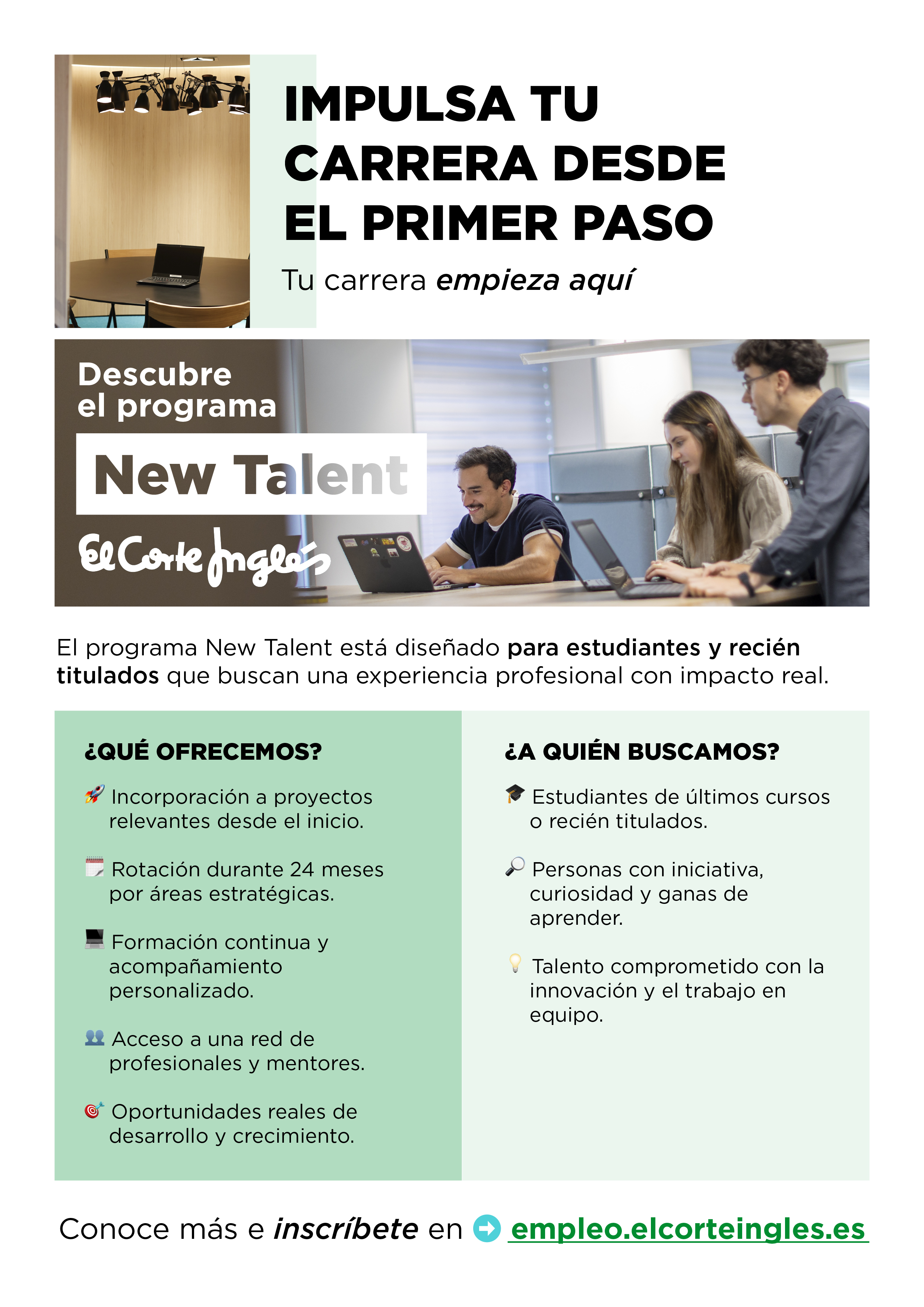 New Talent es el programa de talento Joven del Grupo El Corte Inglés, diseñado para que des tus primeros pasos en el mundo laboral. Una oportunidad única para recién graduados o estudiantes de último año que se quieran incorporar a través de sus prácticas profesionales. Te espera un itinerario de formación y desarrollo de 24 meses diseñado para ti.
